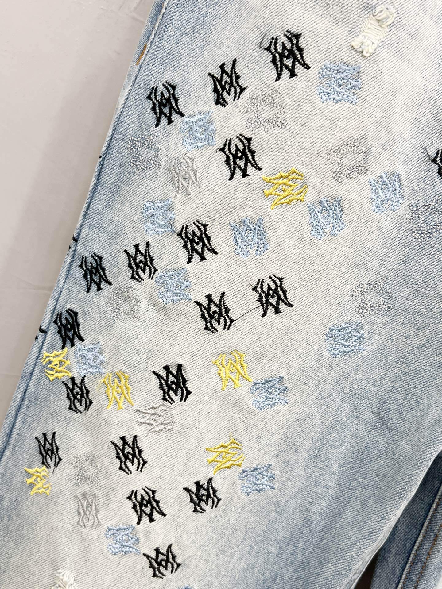 Non-stretch denim jeans. Fading, whiskering, distressing, and embroidered logo pattern throughout.